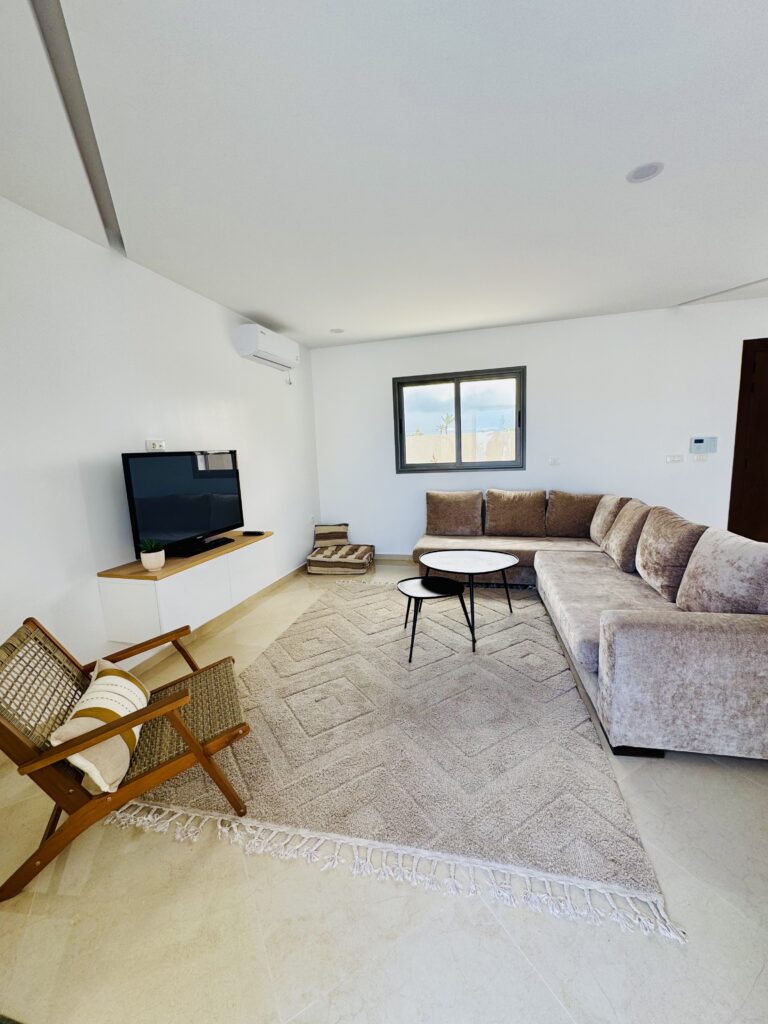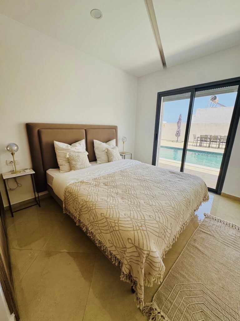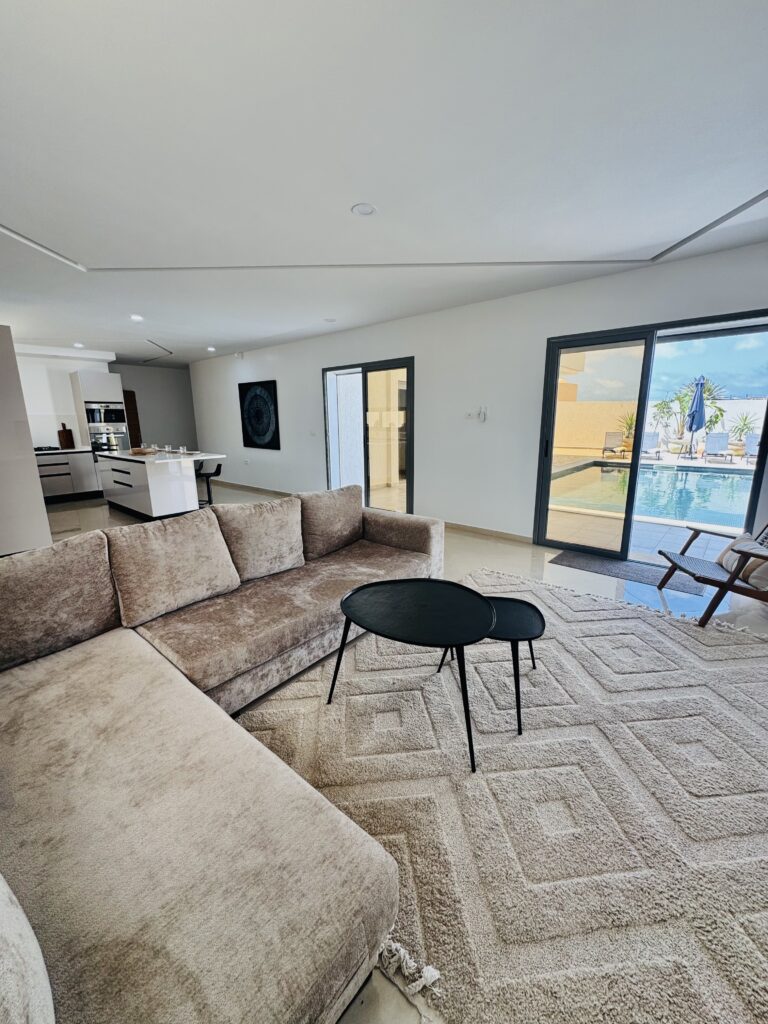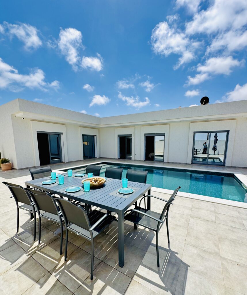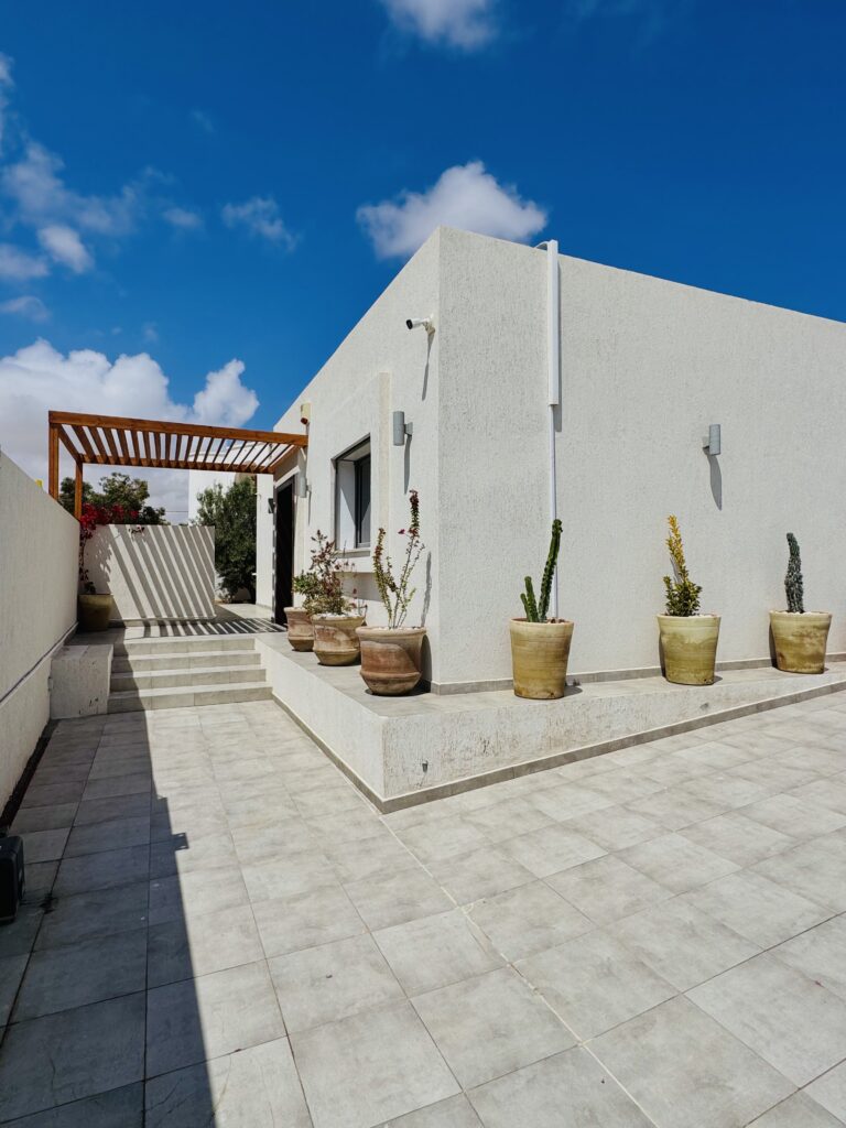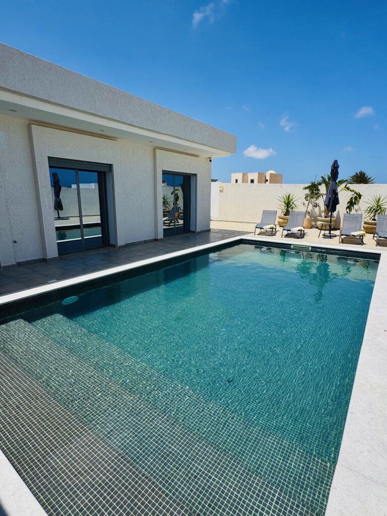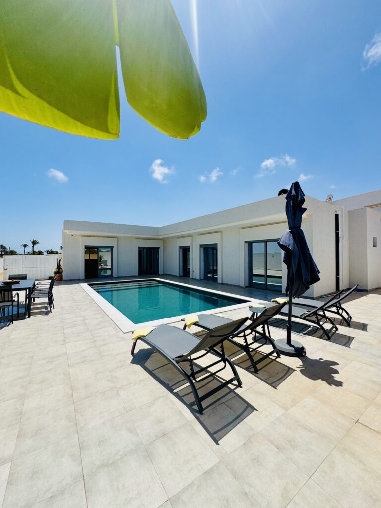 Découvrez cette magnifique villa plain-pied, entièrement neuve, située à seulement cinq minutes des plus belles plages de Djerba. Idéalement positionnée à quelques pas de la mosquée Khaled Ibn El Walid et à huit minutes du centre-ville de Midoun, cette villa allie modernité et confort pour des vacances inoubliables.