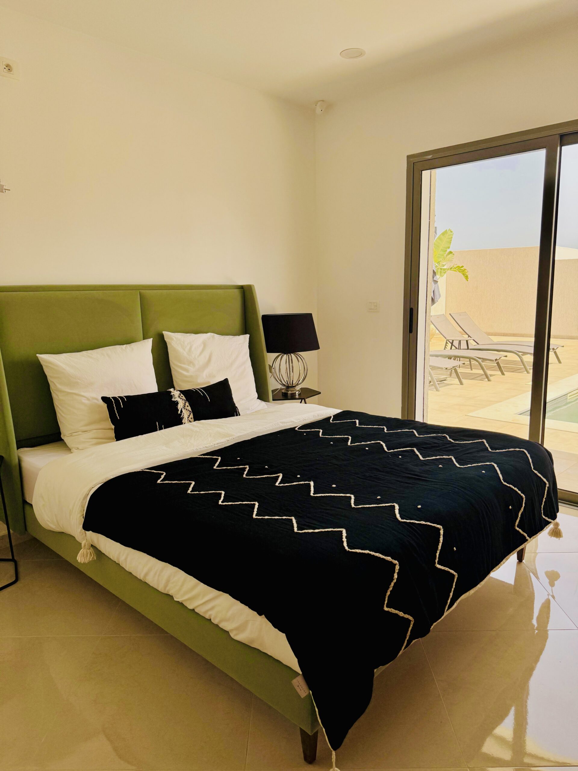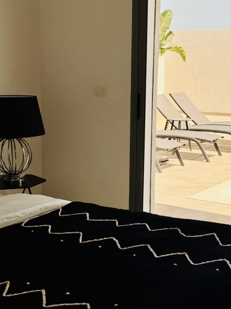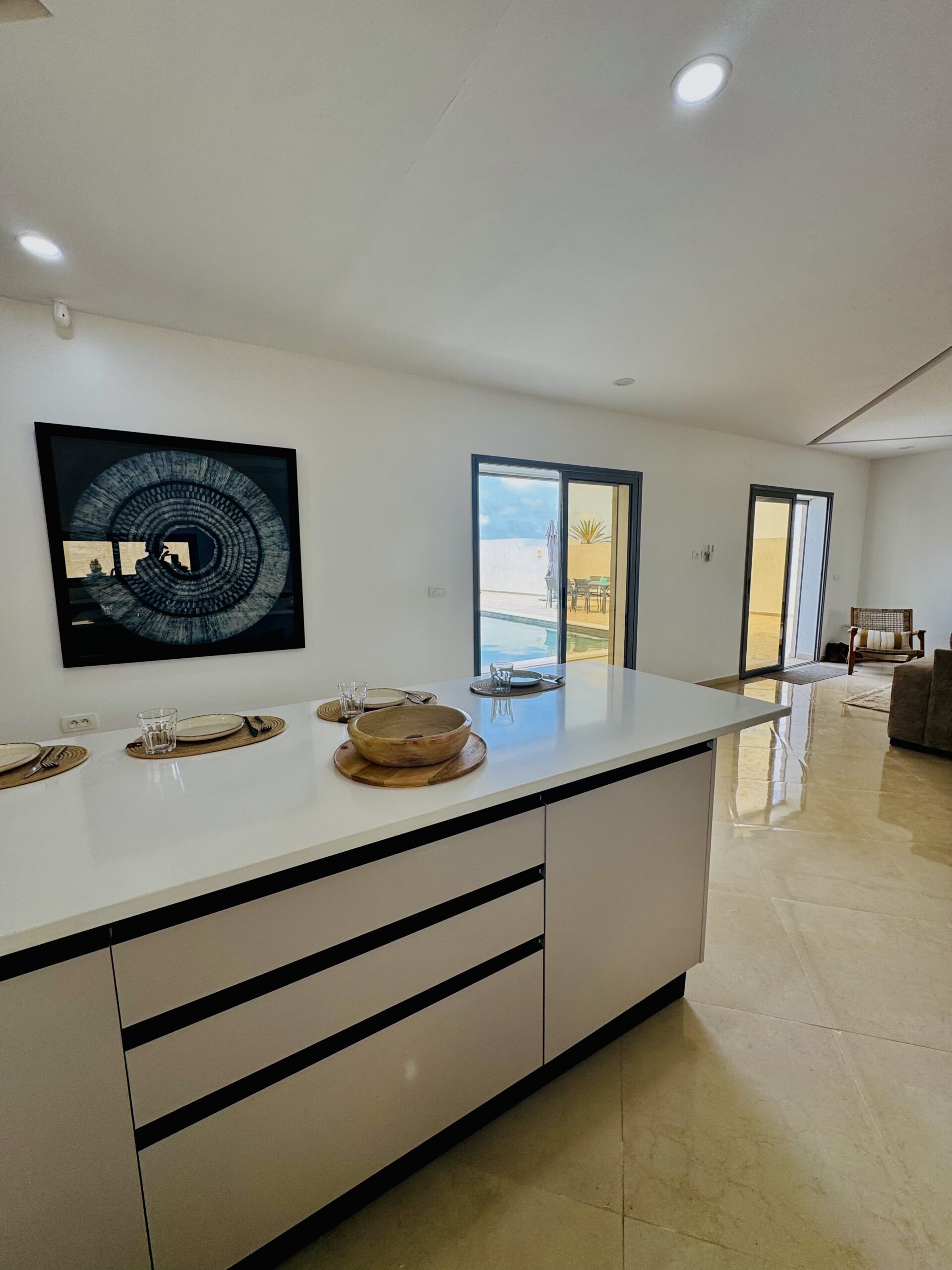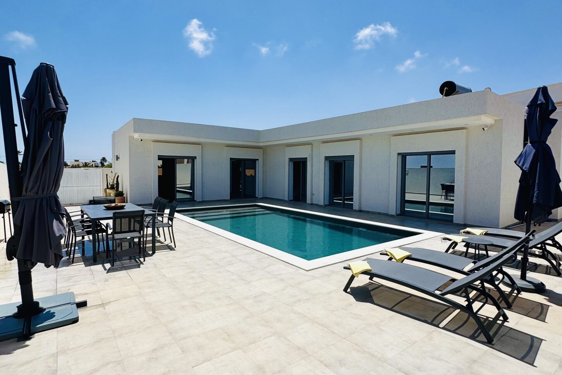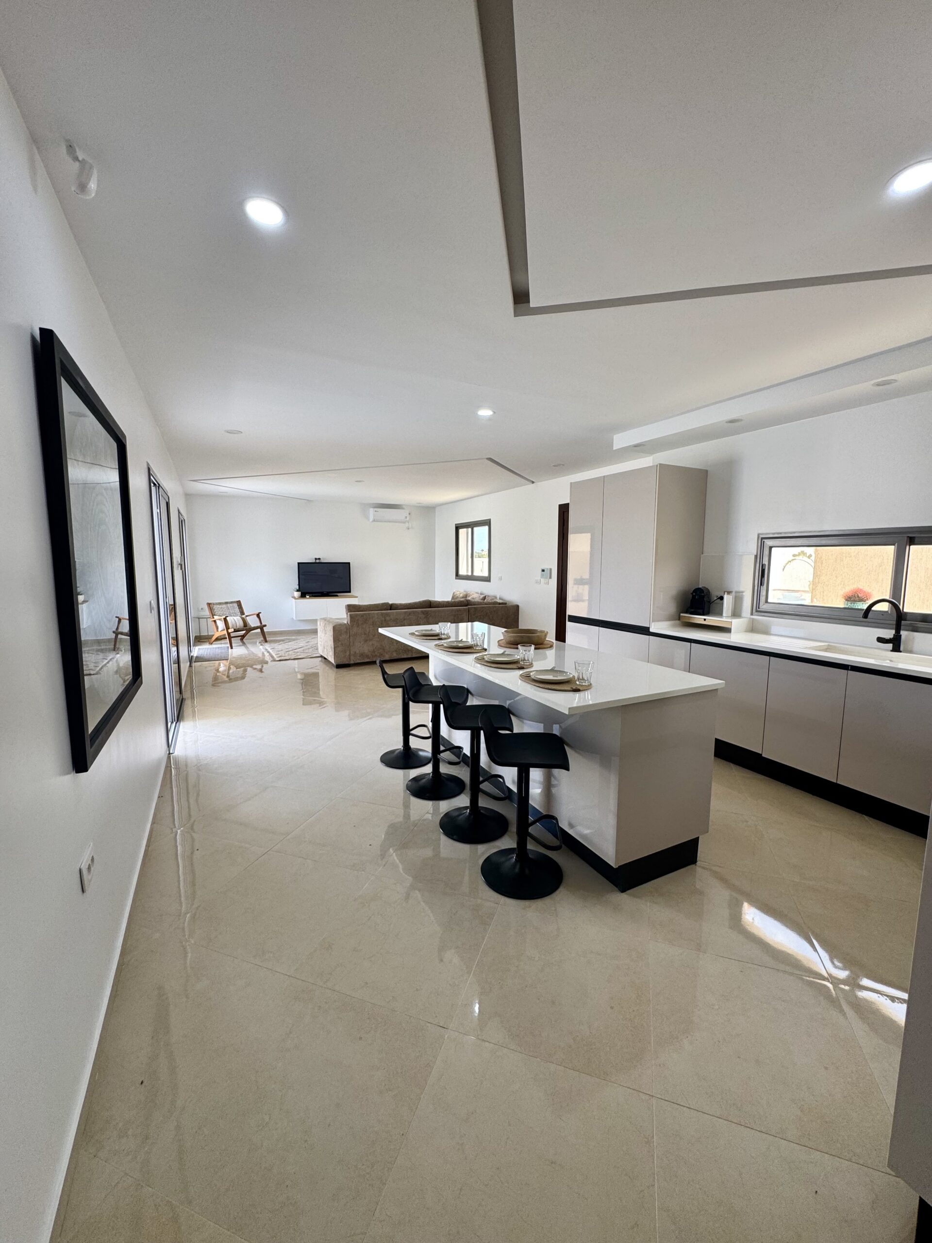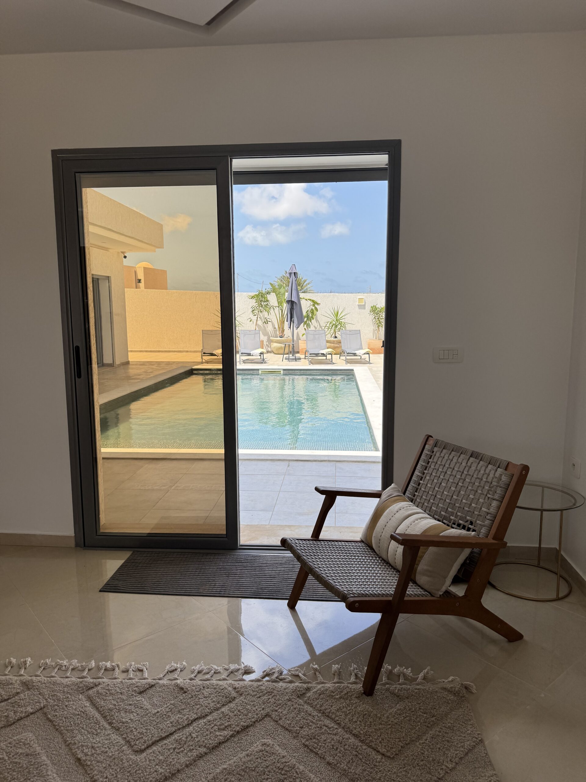 Découvrez cette magnifique villa plain-pied, entièrement neuve, située à seulement cinq minutes des plus belles plages de Djerba. Idéalement positionnée à quelques pas de la mosquée Khaled Ibn El Walid et à huit minutes du centre-ville de Midoun, cette villa allie modernité et confort pour des vacances inoubliables.